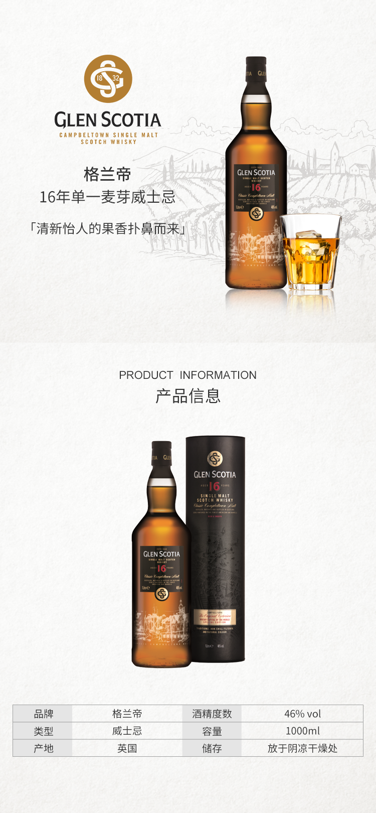 格兰帝16年单一麦芽威士忌酒1L(46%) 1000毫升/瓶