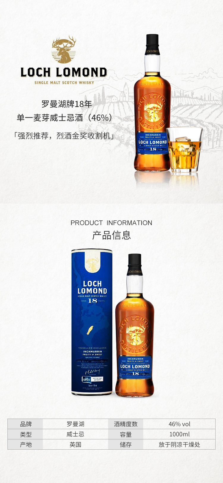 罗曼湖18年单一麦芽威士忌酒 1L(46%) 1000毫升/瓶