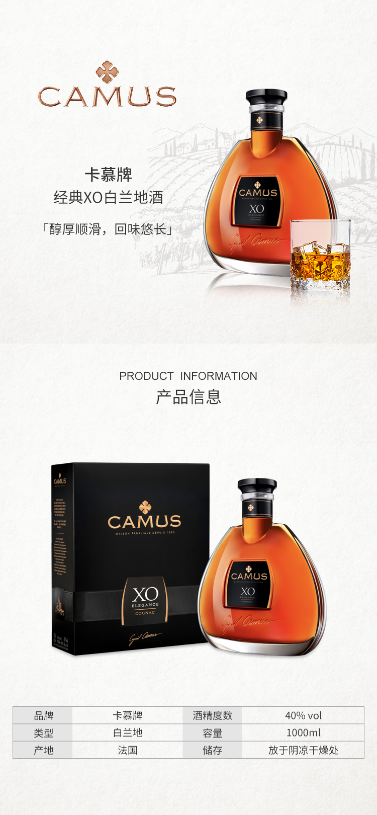 卡 慕 经 典 X O 白 兰 地 酒 1L(40%)