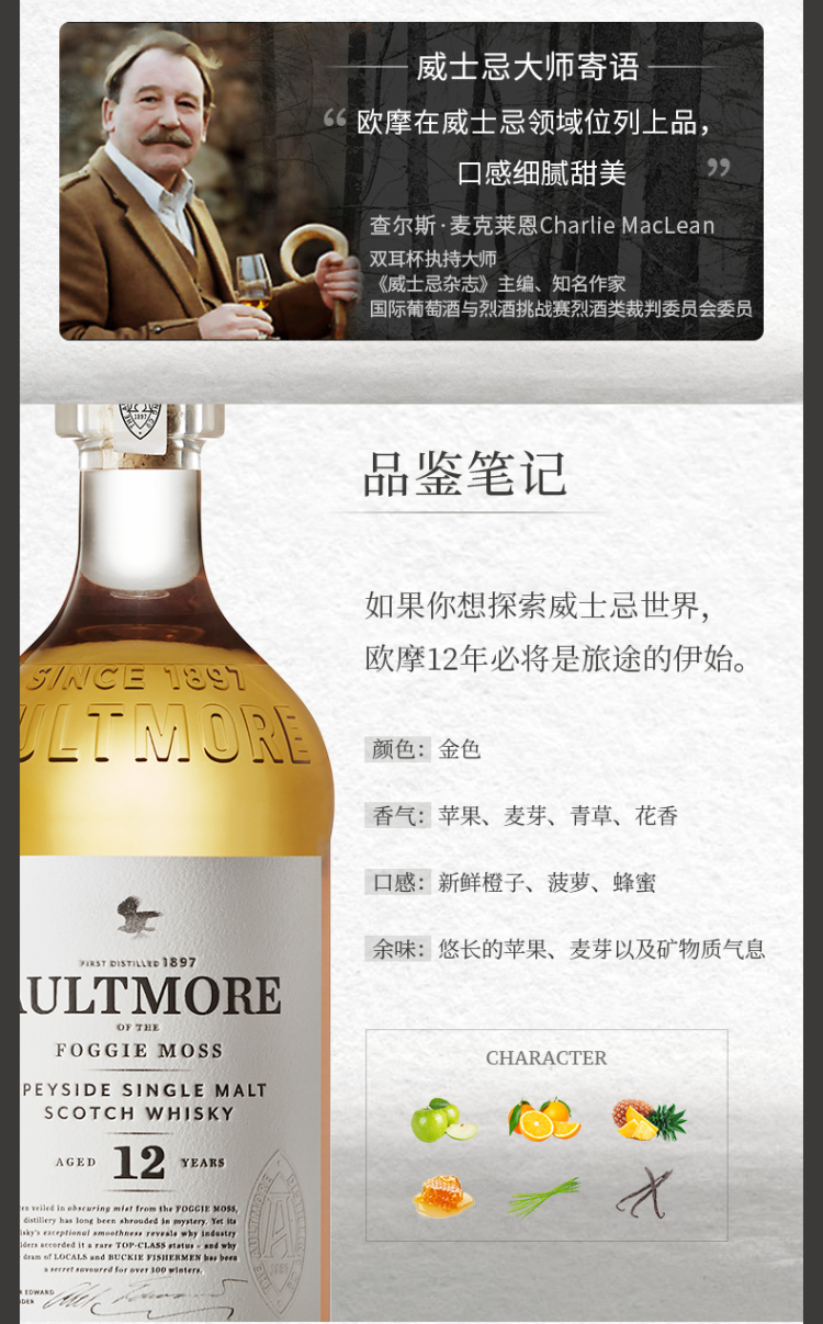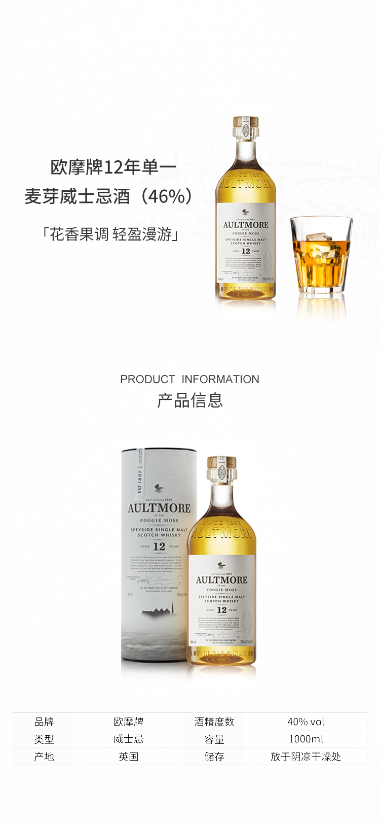 欧摩12年单一麦芽威士忌酒1L(46%) 1000毫升/瓶