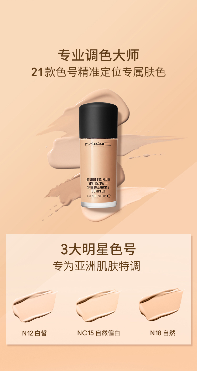 MAC魅可定制无瑕粉底液 SPF15/PA+ #N18 适合自然偏白肤色 30ML
