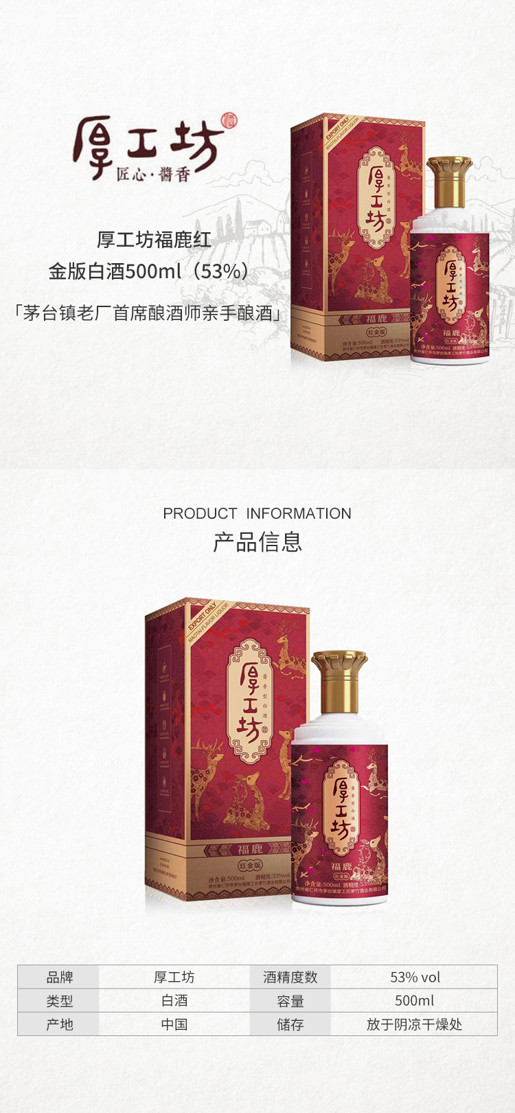 厚工坊福鹿红金版酱香型白酒500ml(53%)【出口版】