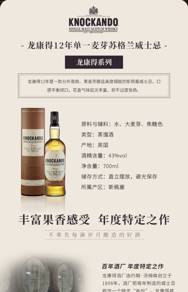 龙康得12年单一麦芽威士忌酒 700ml 700ml/瓶