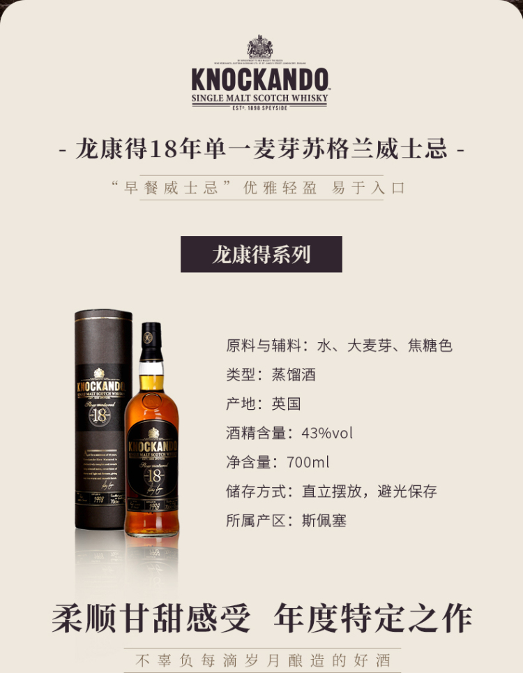 【国行】龙康得18年单一麦芽威士忌酒 700ml
