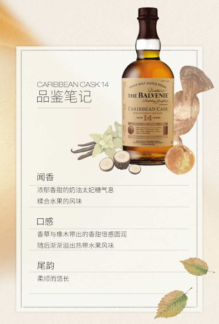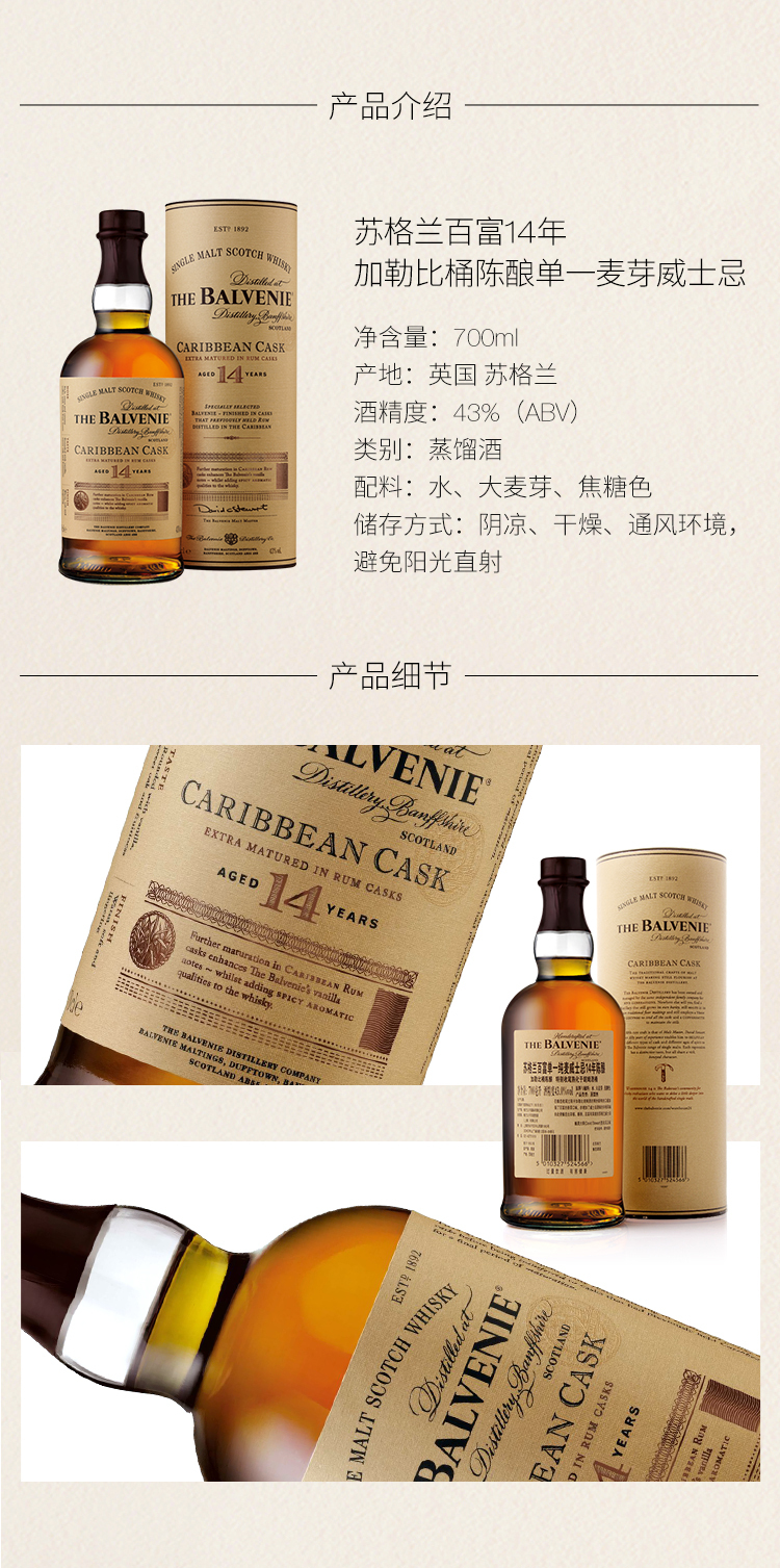 百富14年加勒比桶单一麦芽苏格兰威士忌酒700ml