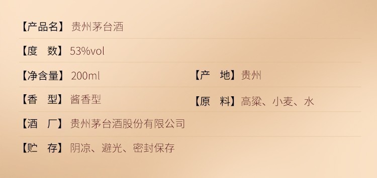 贵州茅台53度飞天茅台酱香型白酒 200ml【出口版】 200ML/瓶