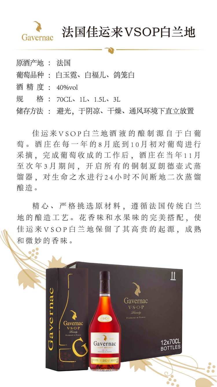 法国佳运来VSOP白兰地酒1000ml