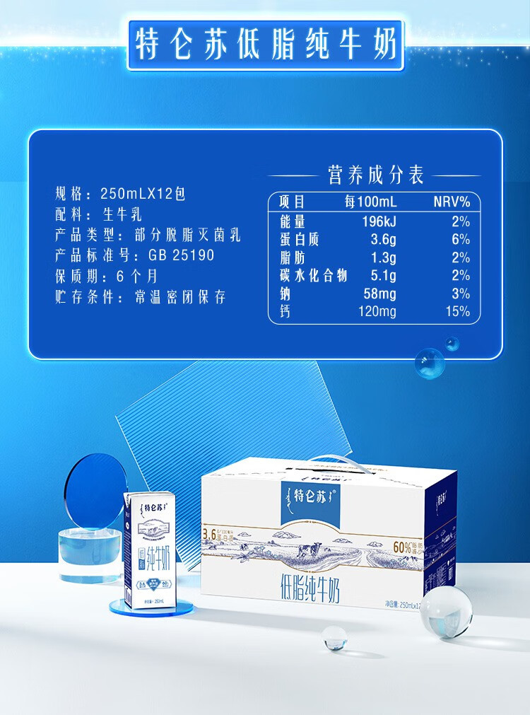 蒙牛特仑苏低脂纯牛奶 250ml*12盒