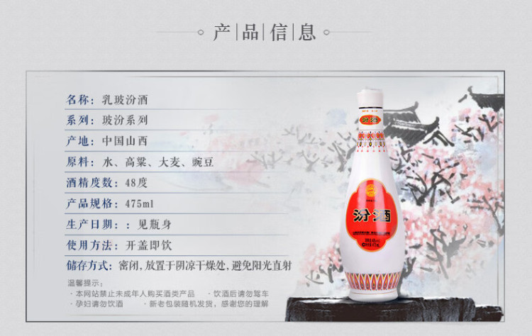 【国行】汾酒48度乳玻汾清香型白酒475ml*6