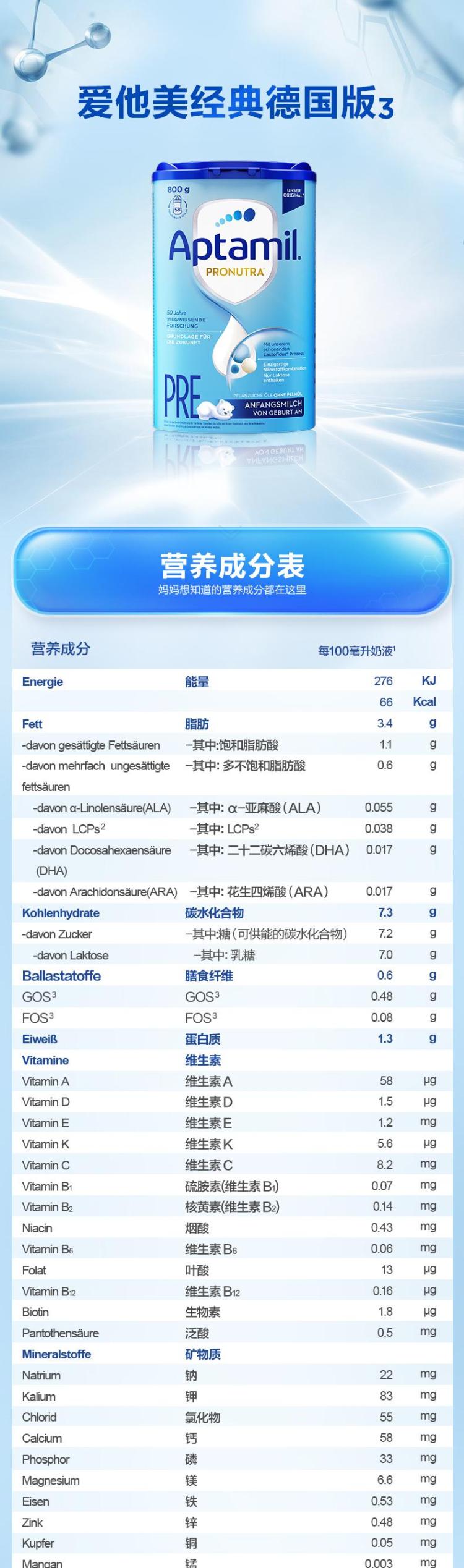 爱他美Aptamil德国经典版婴儿配方奶粉易乐罐Pre段(0-6月龄)800g