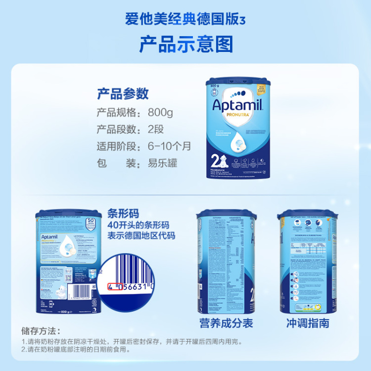 爱他美Aptamil德国经典版较大婴儿配方奶粉易乐罐2段(6-10月龄) 800g(有效期至2026/8/1) 800g/罐