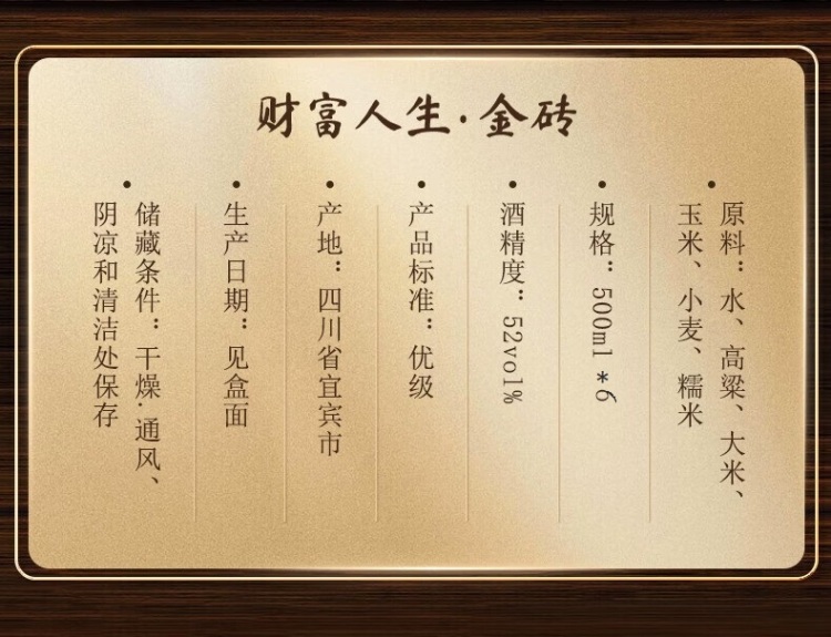 五粮液股份财富人生金砖52度浓香型白酒500ml*6瓶