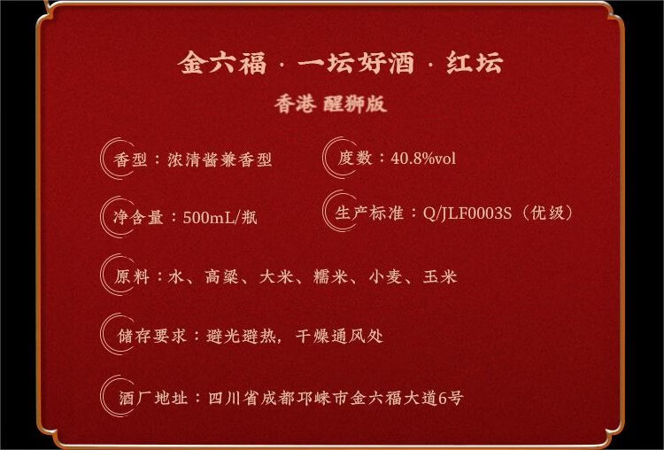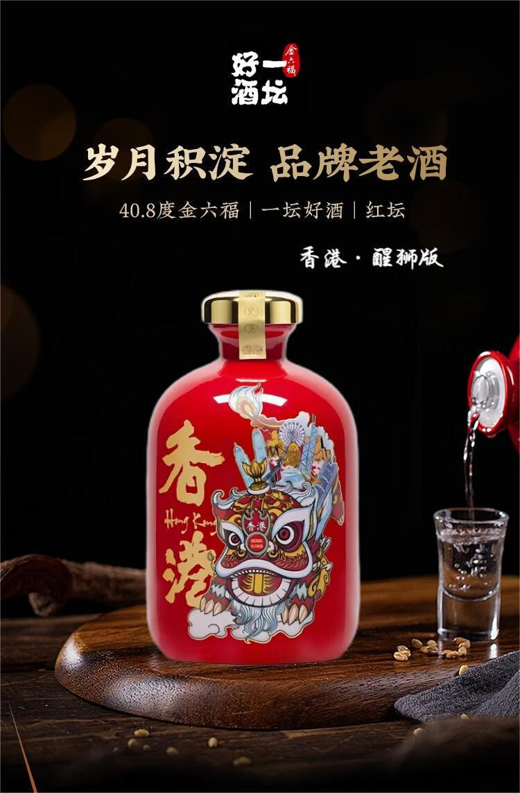 金六福40.8度一坛好酒红坛醒狮版兼香型白酒500ml【出口版】