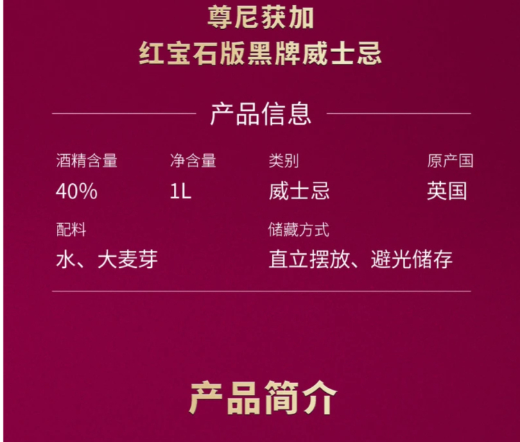 尊尼获加红宝石版黑牌苏格兰威士忌酒1L(40%)
